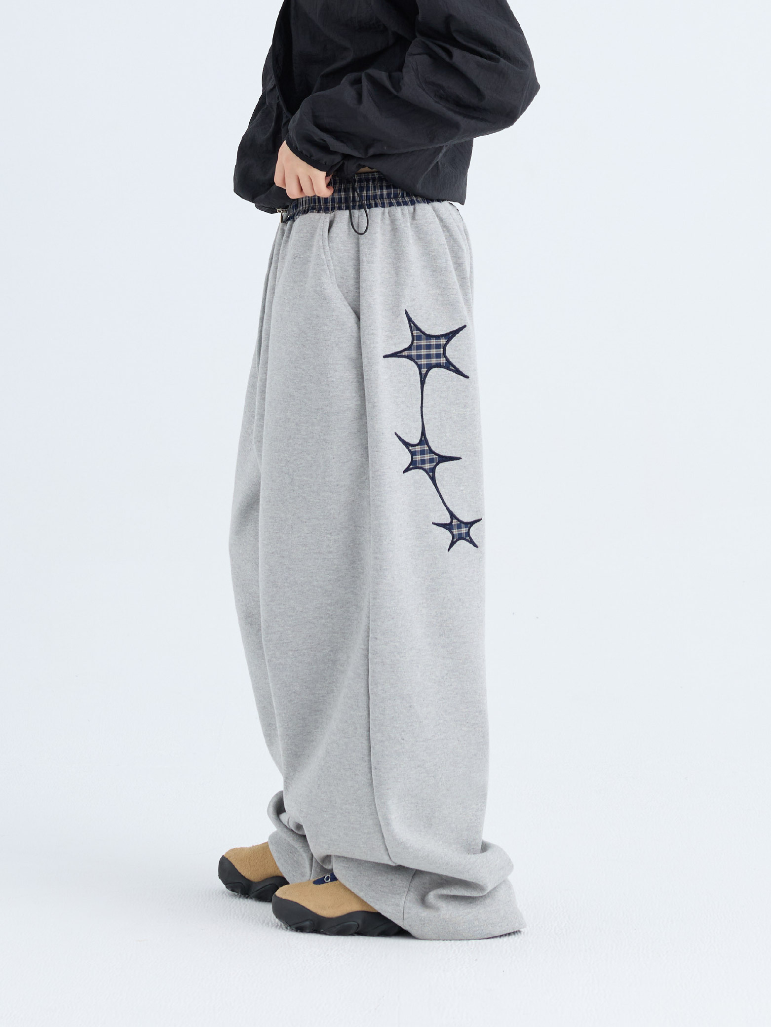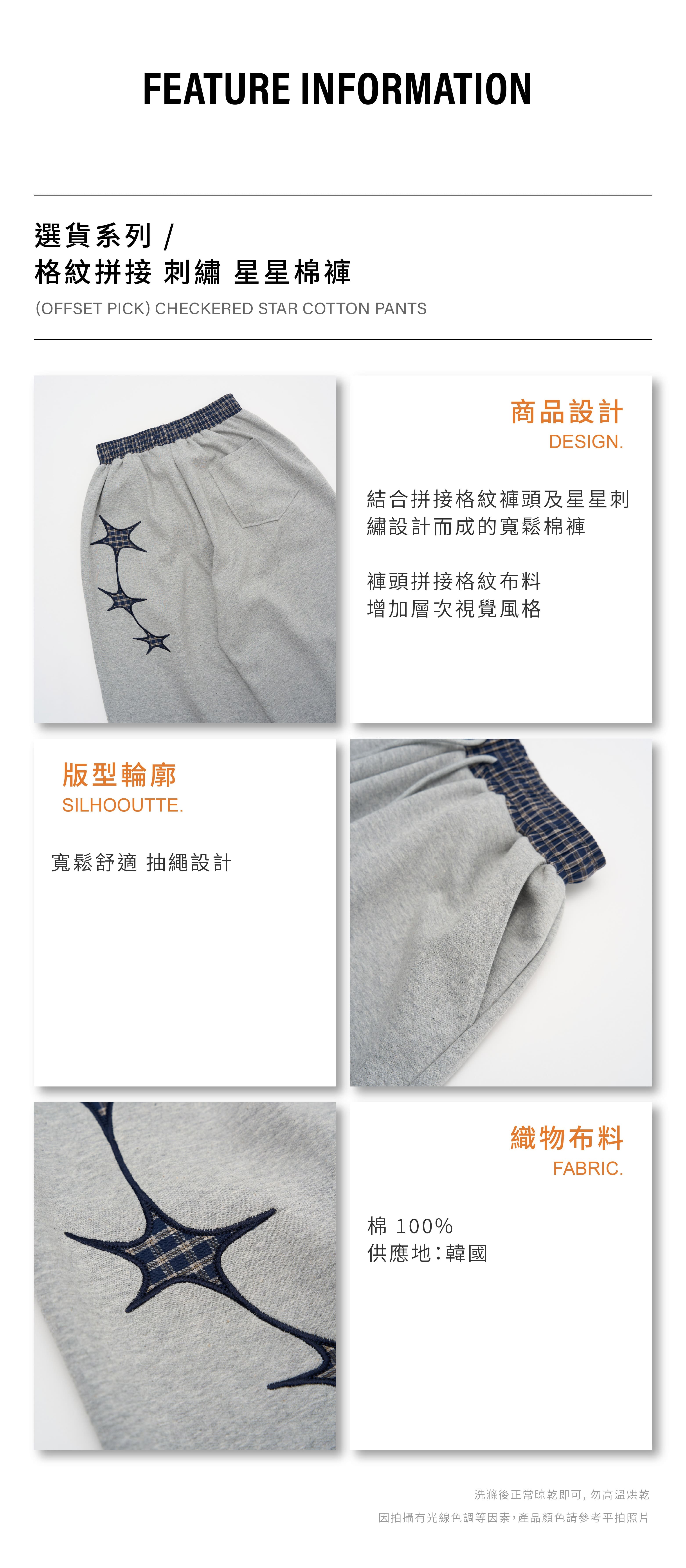 格紋拼接 刺繡 星星棉褲 [PB090]