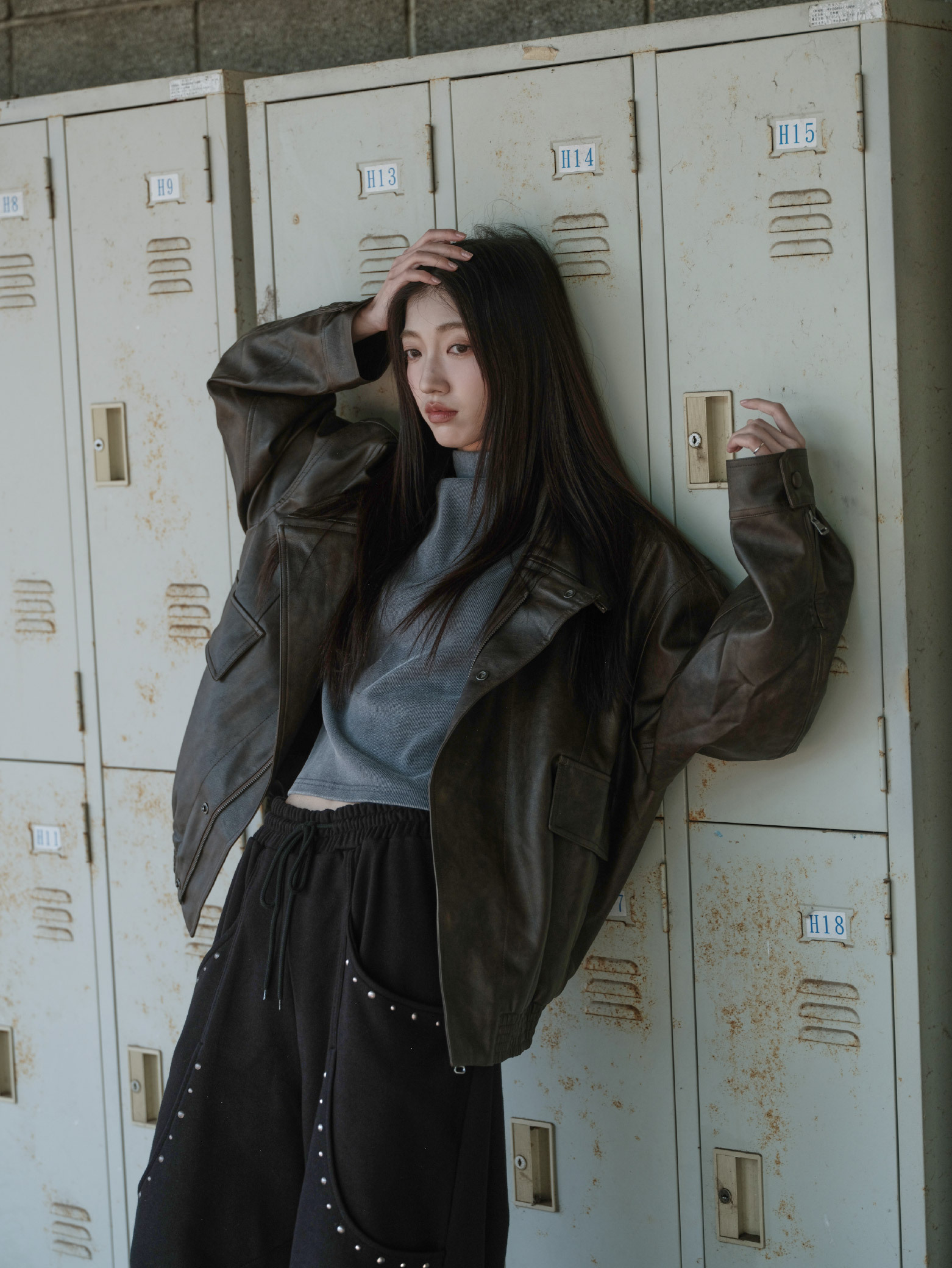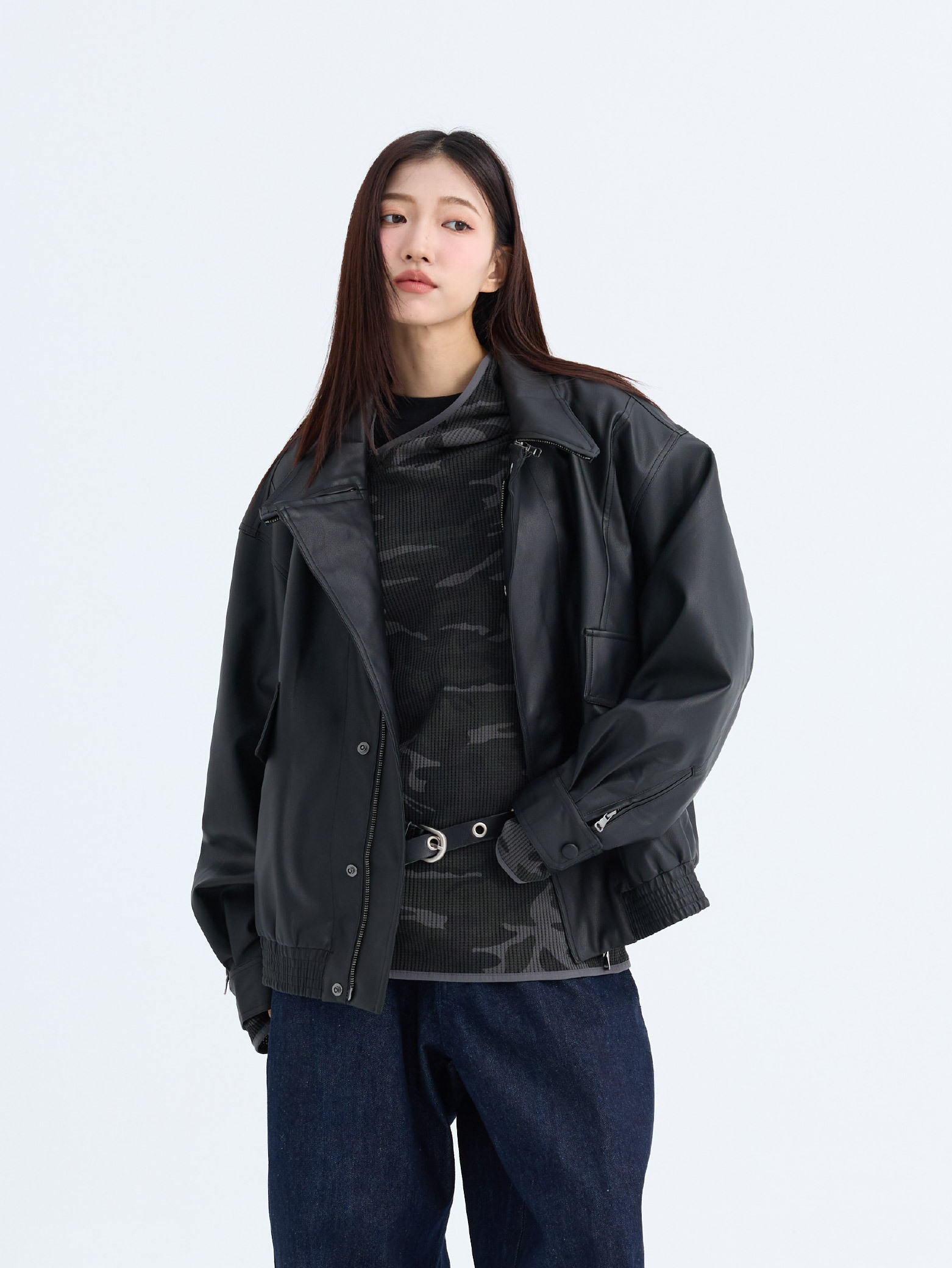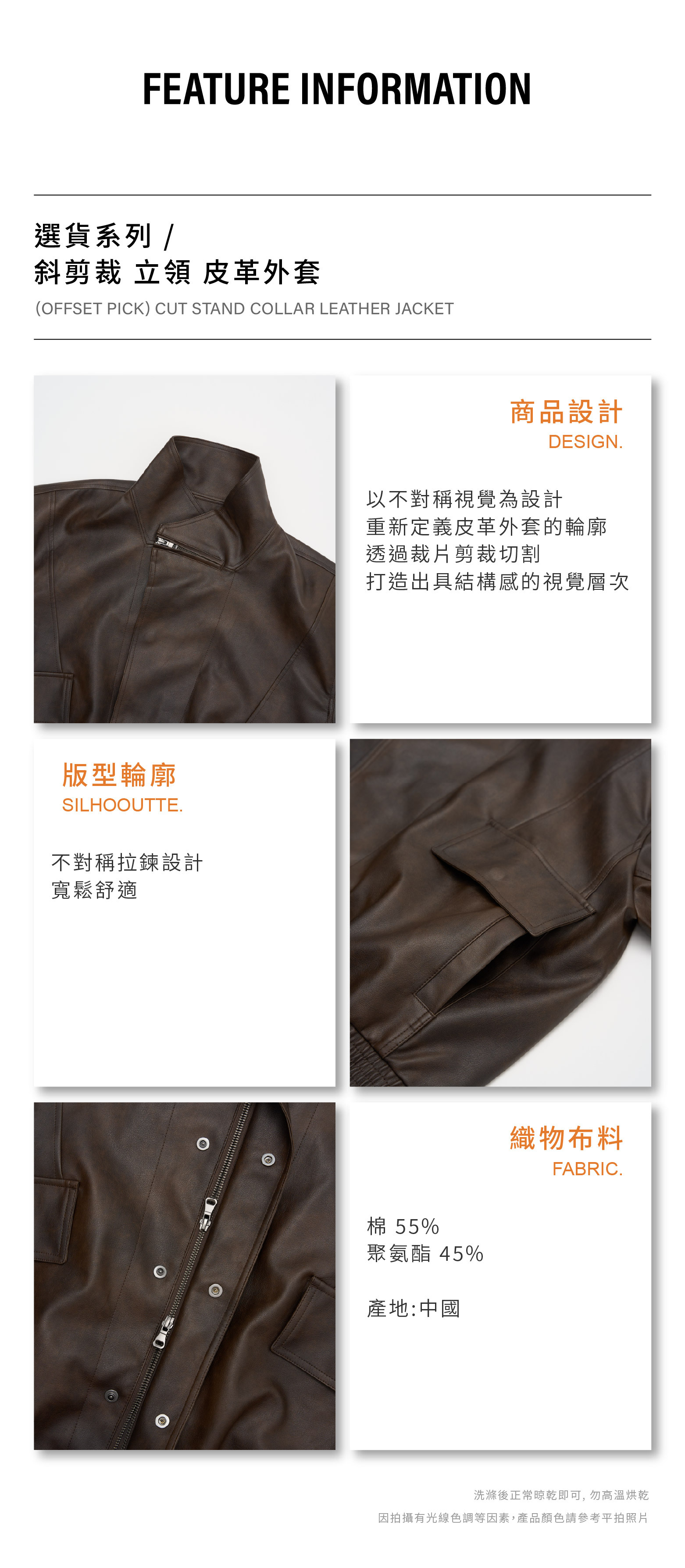 斜剪裁 立領 皮革外套 [PJ032]