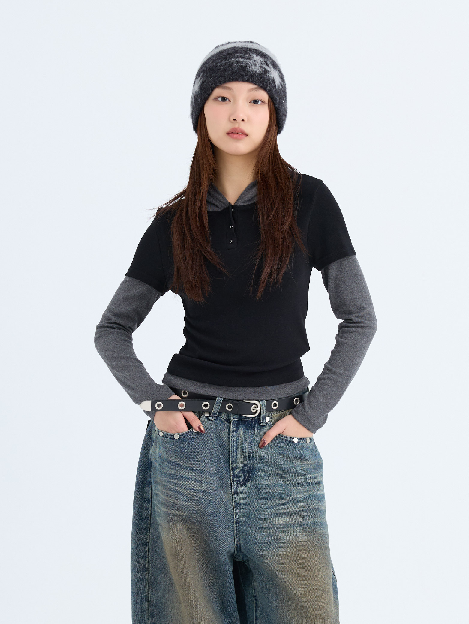 女裝 假兩件 撞色連帽 長Tee [PT053]