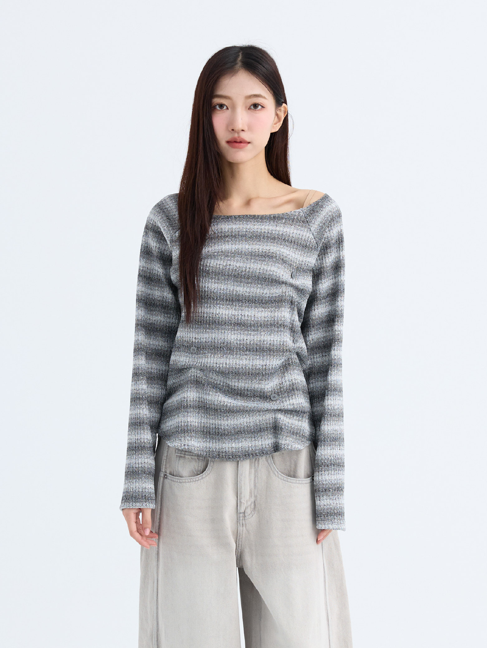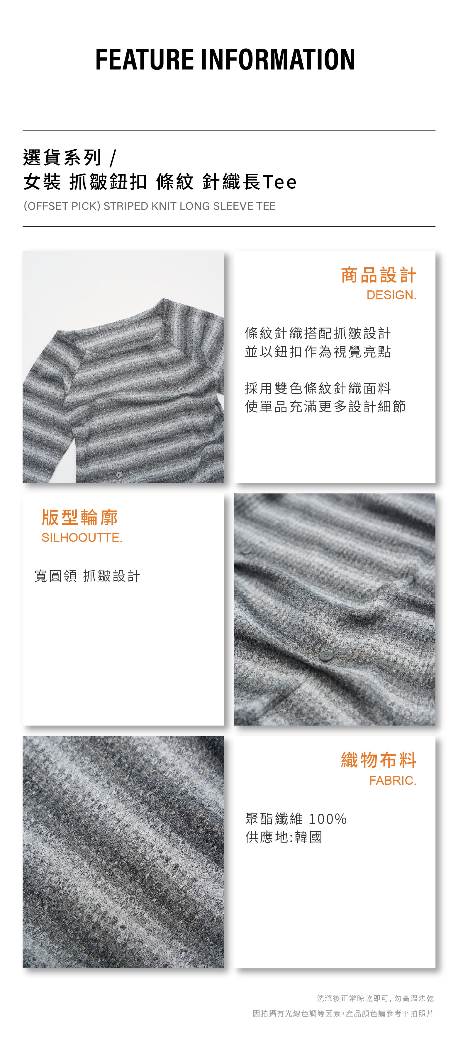 女裝 抓皺鈕扣 條紋 針織長Tee [PT060]